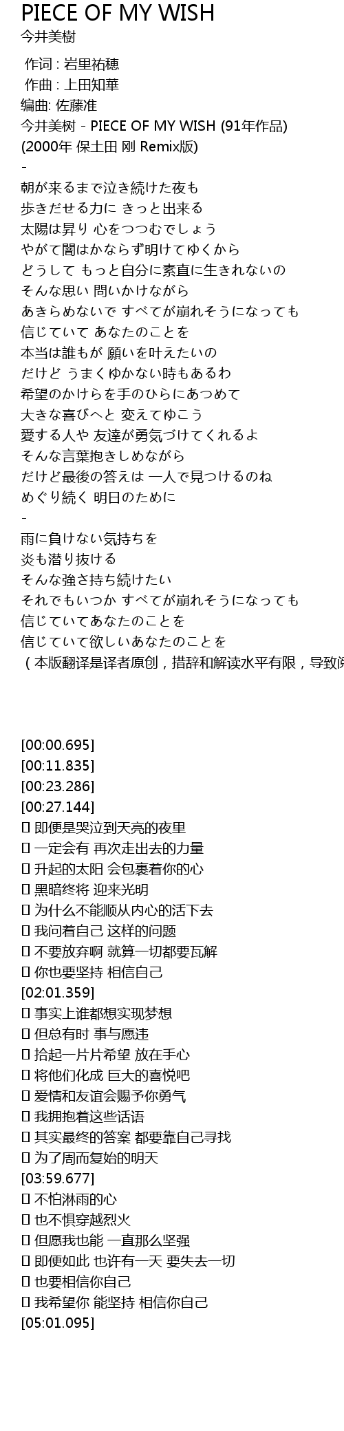 | [00:11.835] | 今井美树 - PIECE OF MY WISH (91年作品) |