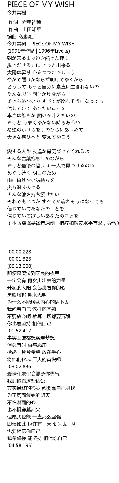 | [00:01.323] | 今井美树 - PIECE OF MY WISH |
