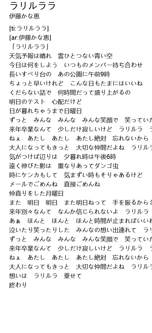 | [02:25.628] | 来年別々なんて なんか信じられないよ ラリルラ ラリルララ |