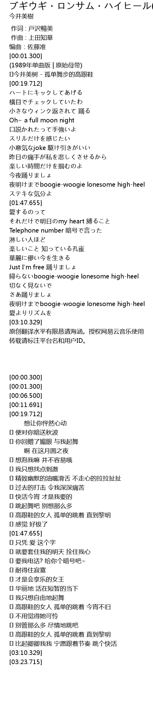 | [01:34.423] | yè míng boogiewoogie lonesome highheel |