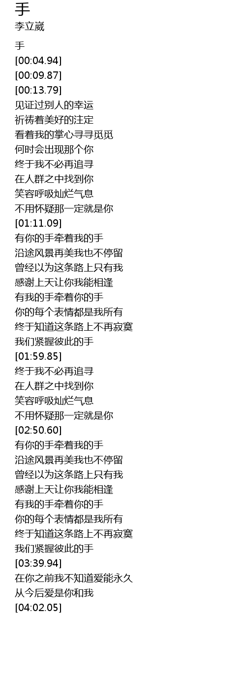 | [01:12.93] | yǒu nǐ de shǒu qiān zhe wǒ de shǒu |