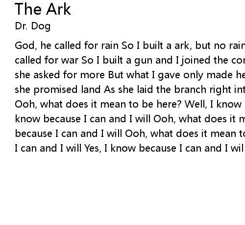 God, he called for rain So I built a ark, but no rain came I was ashamed Man, he called for war So I built a gun and I joined the corps But I was unsure Love, she asked for more But what I gave only made her poor I wasn't sure The dove, she promised land As she laid the branch right into my hand There was no land Ooh, what does it mean to be here? Well, I know because I can and I will Yes, I know because I can and I will Ooh, what does it mean to be here? Well, I know because I can and I will Ooh, what does it mean to be here? Well, I know because I can and I will Yes, I know because I can and I wil |