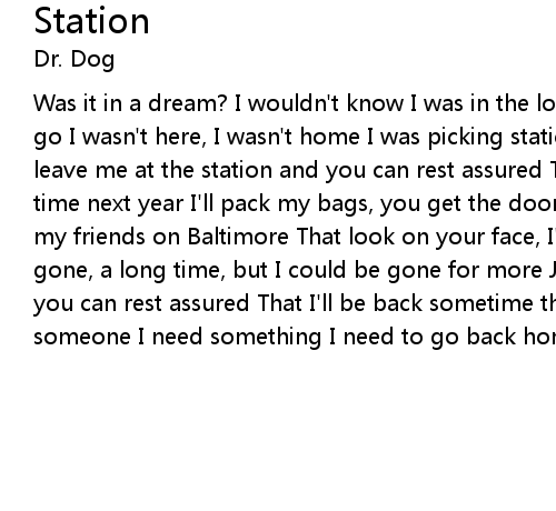 Was it in a dream? I wouldn't know I was in the lowlands where all the old folks go I wasn't here, I wasn't home I was picking static up on a broken radio Just leave me at the station and you can rest assured That I'll be back sometime this time next year I'll pack my bags, you get the door Here's a stack of tokens for my friends on Baltimore That look on your face, I've seen it before I'll be gone, a long time, but I could be gone for more Just leave me at the station and you can rest assured That I'll be back sometime this time next year I need someone I need something I need to go back home |