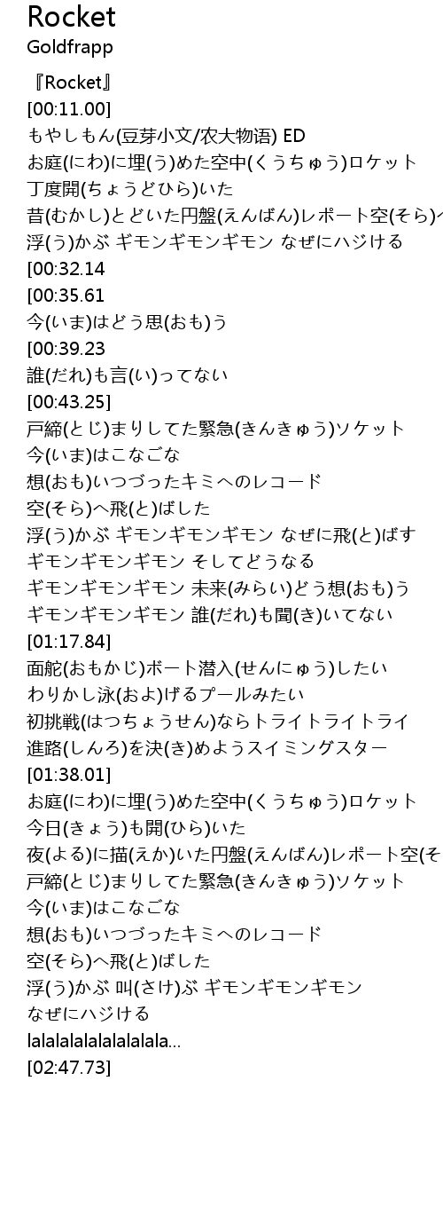 | [02:09.35] | 夜(よる)に描(えか)いた円盤(えんばん)レポート空(そら)ではじけた |