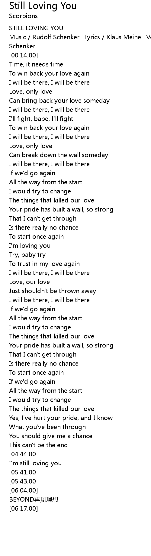 | [06:00.00][05:43.00][05:10.00][05:01.00] | I'm still loving you |