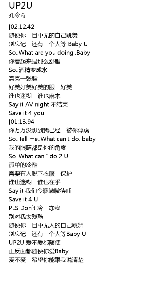 | [02:33.56][02:12.42][02:03.00][00:28.84][00:20.40] | UP2U oh baby UP2U |