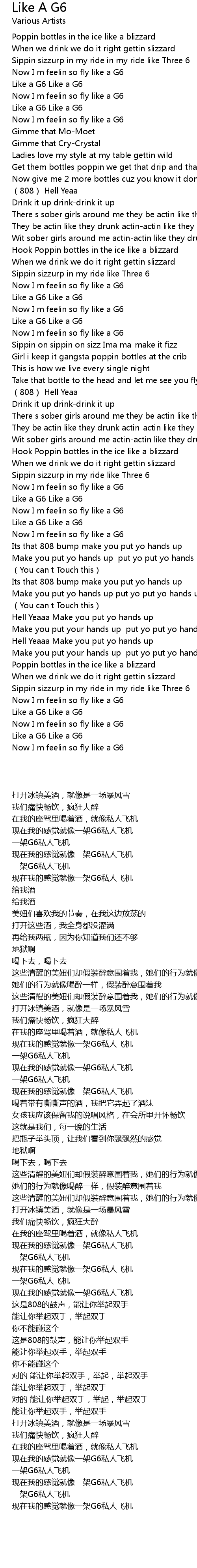 | [00:19.36] | Now I m feelin so fly like a G6 |