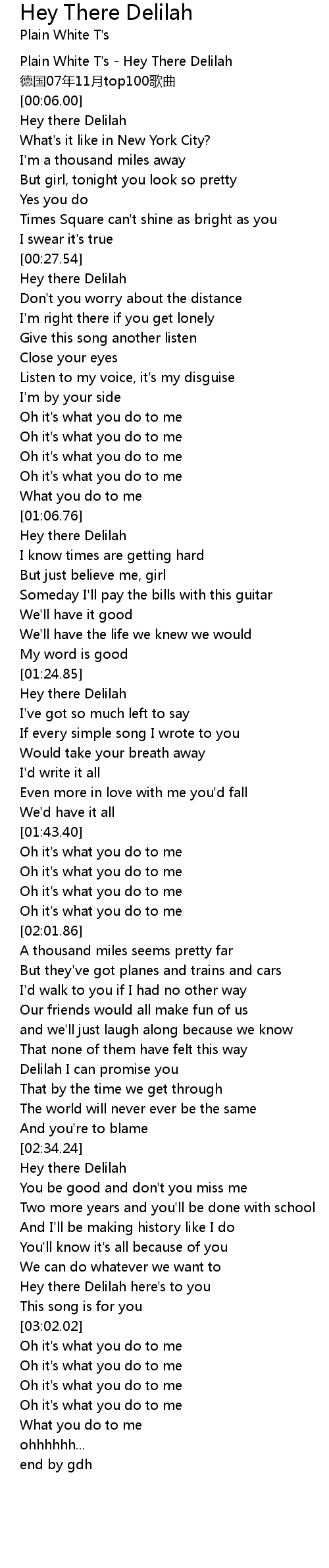 | [00:00.00] | Plain White T' s Hey There Delilah |