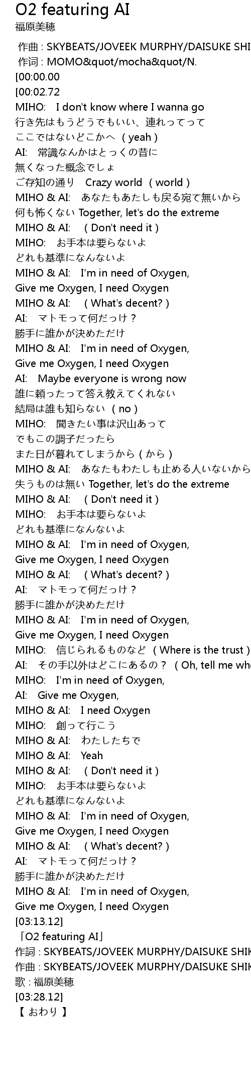 | [03:07.62] | MIHO AI: I' m in need of Oxygen, |