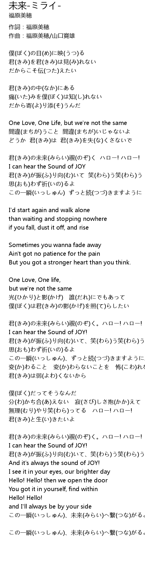 | [03:01.53] | 君(きみ)の未来(みらい)覗(のぞ)く。ハロー! ハロー! |