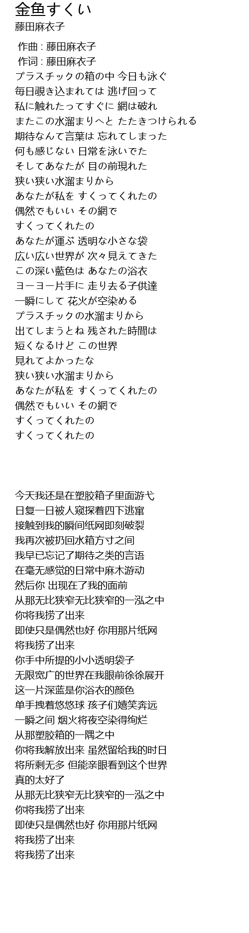 | [00:17.22] | プラスチックの箱の中 今日も泳ぐ |