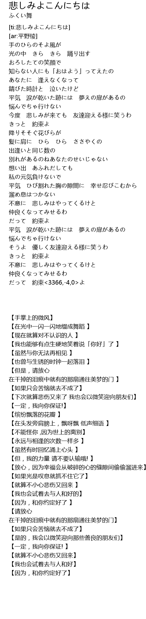 | [01:08.773] | 【下次就算悲伤又来了 我也会以微笑迎向朋友们】 |