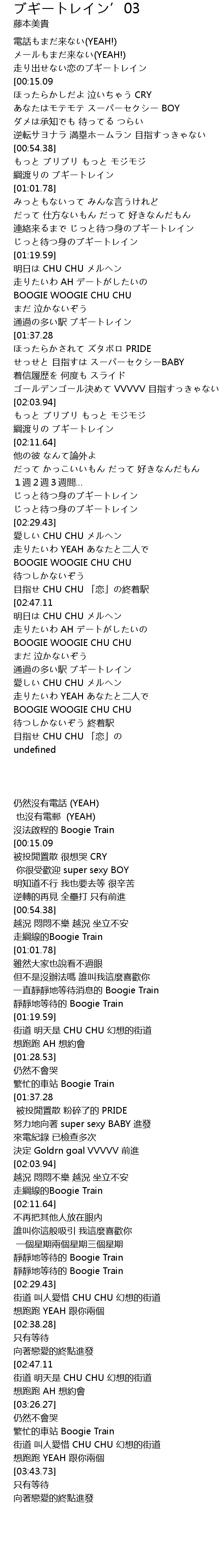 | [01:11.03] | 連絡来るまで じっと待つ身のブギートレイン |