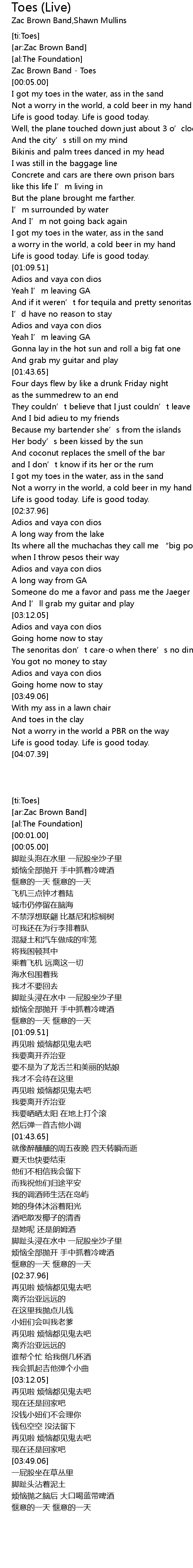| [00:01.00] | Zac Brown Band Toes |