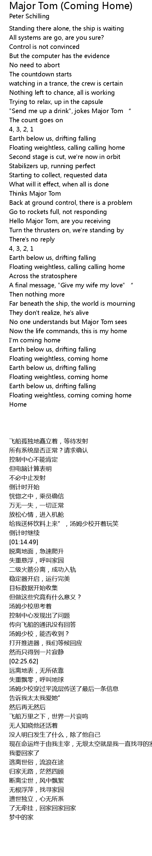 | [02:13.76] | Hello Major Tom, are you receiving |
