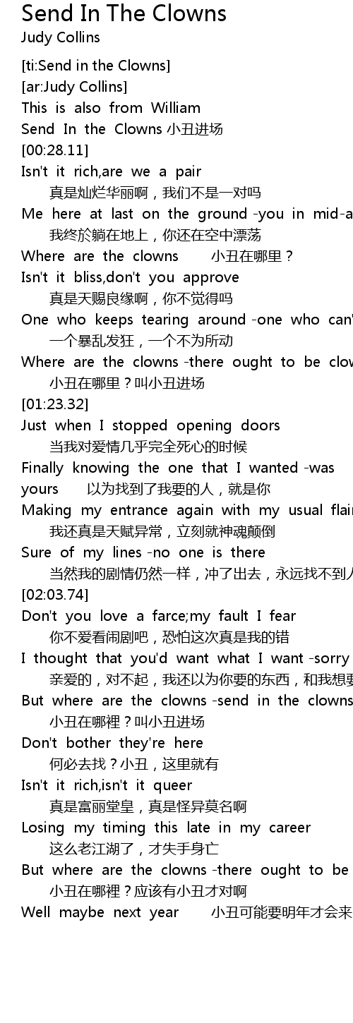 | [02:23.73] | But where are the clowns -send in the clowns 小丑在哪裡?叫小丑进场 |