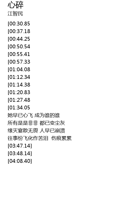| [02:34.20][00:57.33] | 我无法后悔 只因心已碎 |