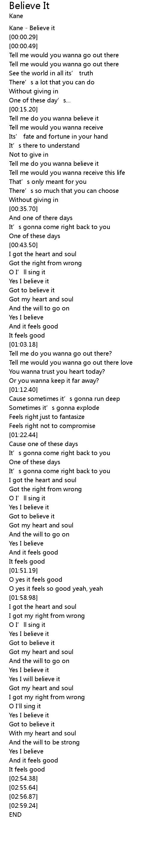| [00:00.00] | Kane - Believe it |