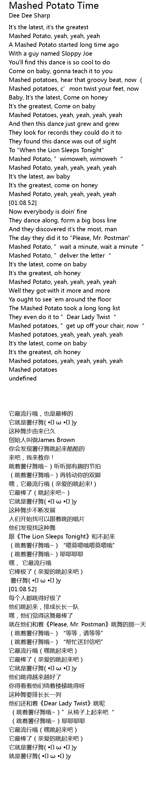 | [02:19.23] | Mashed potatoes, yeah, yeah, yeah, yeah |
