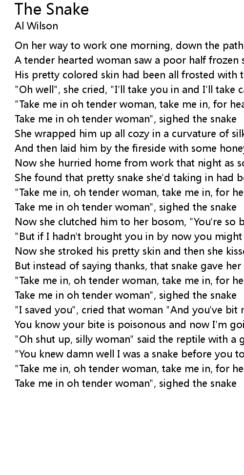 "Take me in, oh tender woman, take me in, for heaven's sake |