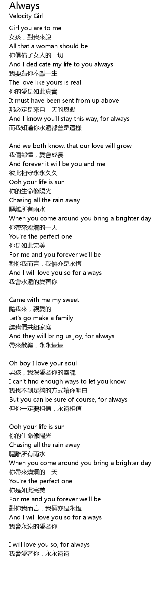 | wǒ huì yǒng yuǎn de ài zhe nǐ | |