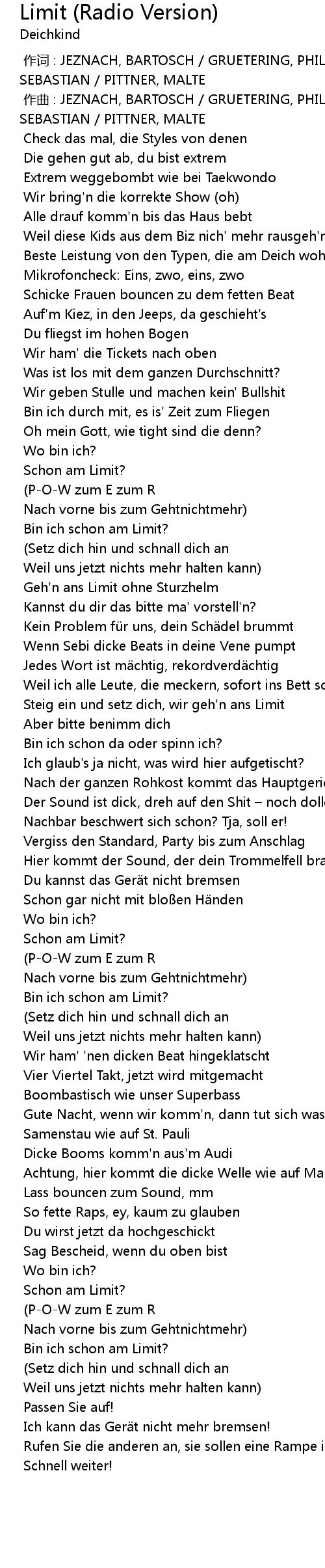 | [01:01.57] | Geh' n ans Limit ohne Sturzhelm |