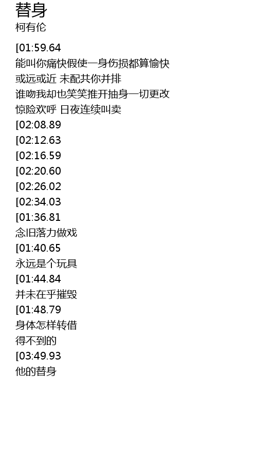 | [00:19.56][01:59.64][03:18.86][04:03.64] | 柯有伦-替身(粤) |