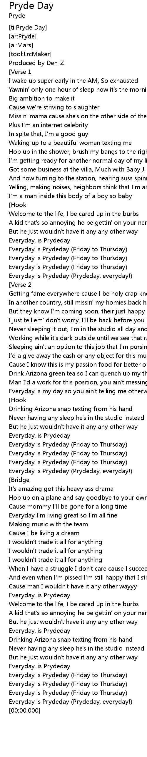 | [01:01.656] | Everyday is Prydeday (Prydeday, everyday!) |