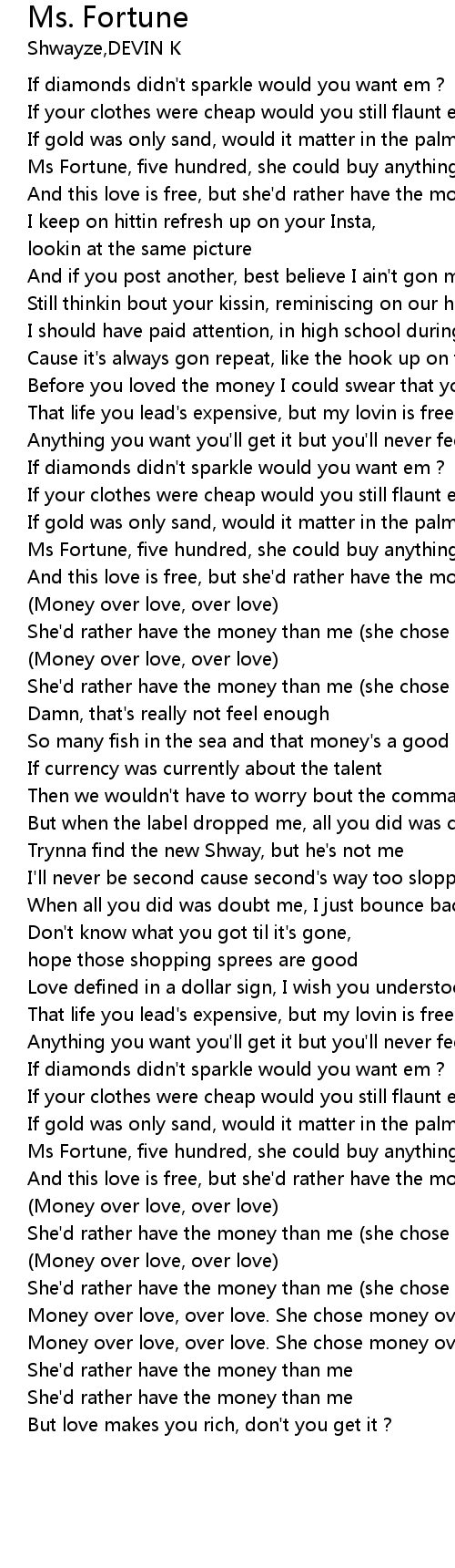 | [00:11.81] | Ms Fortune, five hundred, she could buy anything that she wanted |
