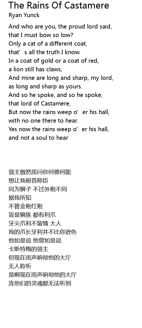 | [01:15.02] | 是啊现在雨声响彻他的大厅 |