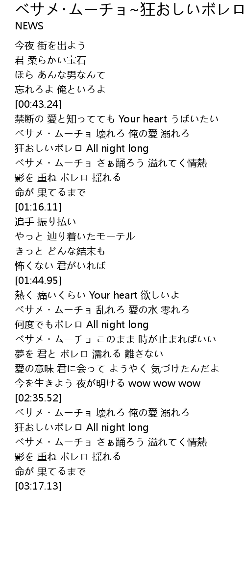 | [02:54.48] | ベサメ・ムーチョ 壊れろ 俺の愛 溺れろ |
