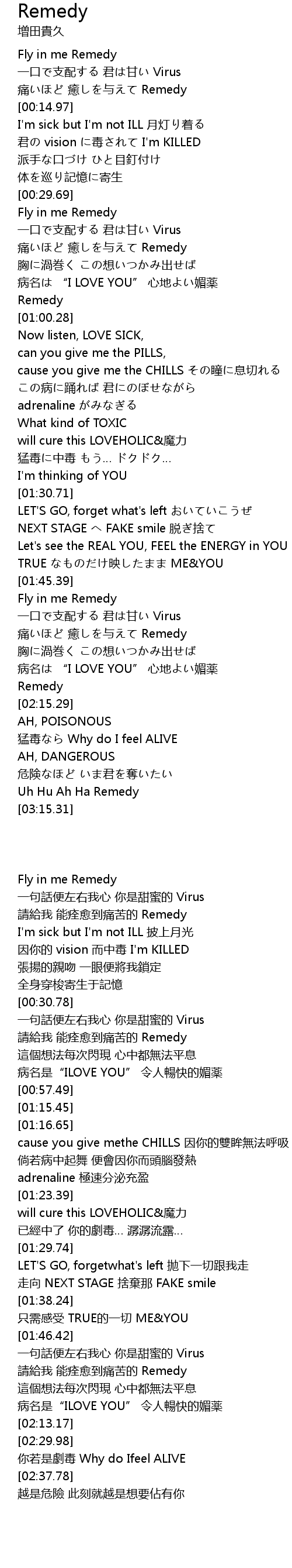 | [00:37.75] | 請給我 能痊愈到痛苦的 Remedy |