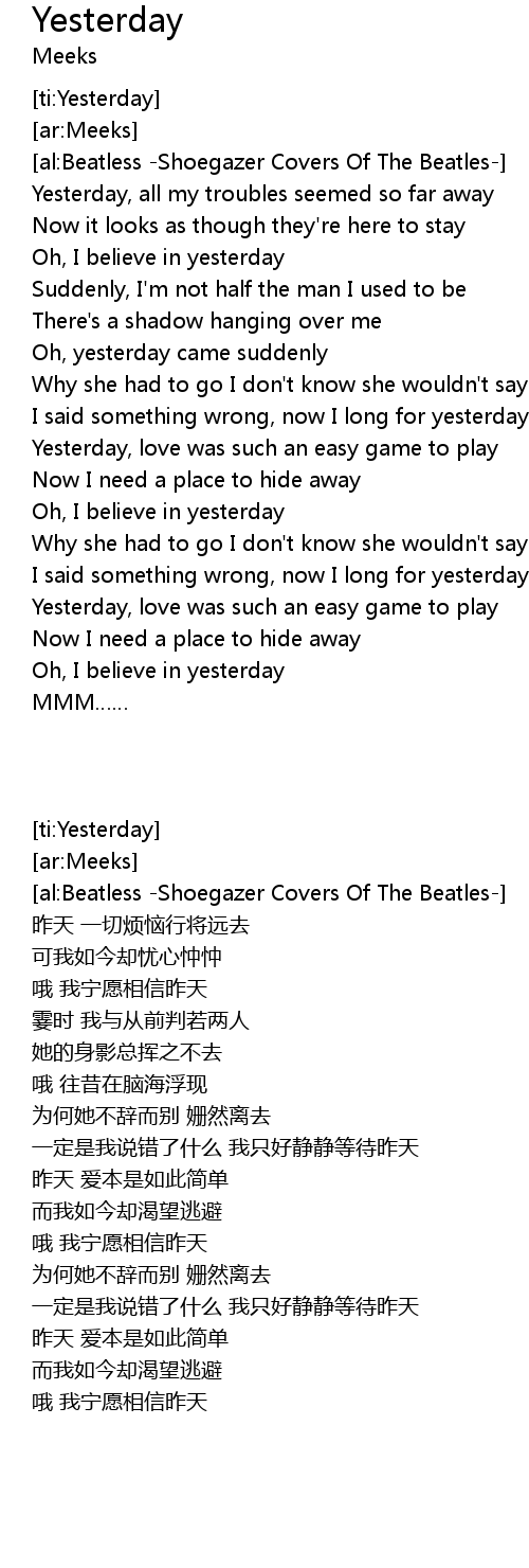 | [00:13.13] | Yesterday, all my troubles seemed so far away |