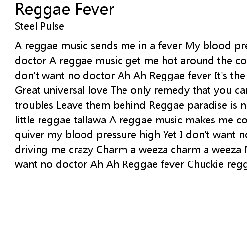A reggae music sends me in a fever My blood pressure high Yet I don't want no doctor A reggae music get me hot around the collar My blood pressure high Yet I don't want no doctor Ah Ah Reggae fever It's the feeling I've been dreaming of Great universal love The only remedy that you can find So skank away your troubles Leave them behind Reggae paradise is nice nice nice Reggae big reggae little reggae tallawa A reggae music makes me cold till I wanna shiver My liver quiver my blood pressure high Yet I don't want no doctor A reggae music is driving me crazy Charm a weeza charm a weeza My blood pressure high Yet I don't want no doctor Ah Ah Reggae fever Chuckie reggae music.