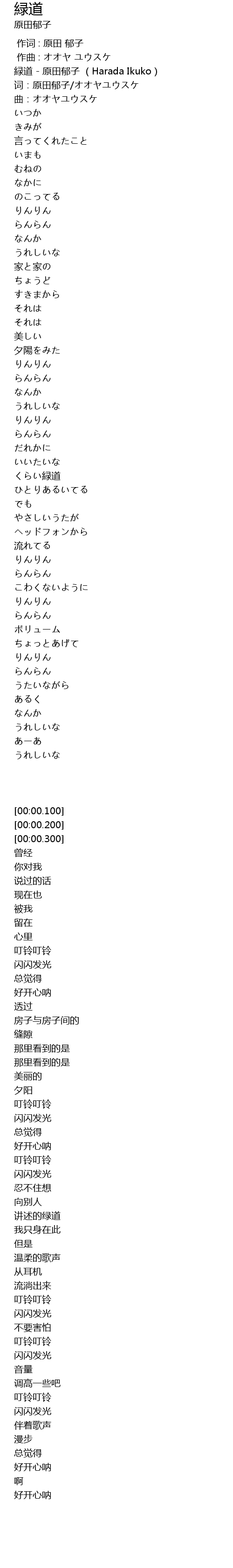 | [00:00.100] | 緑道 - 原田郁子 (Harada Ikuko) |