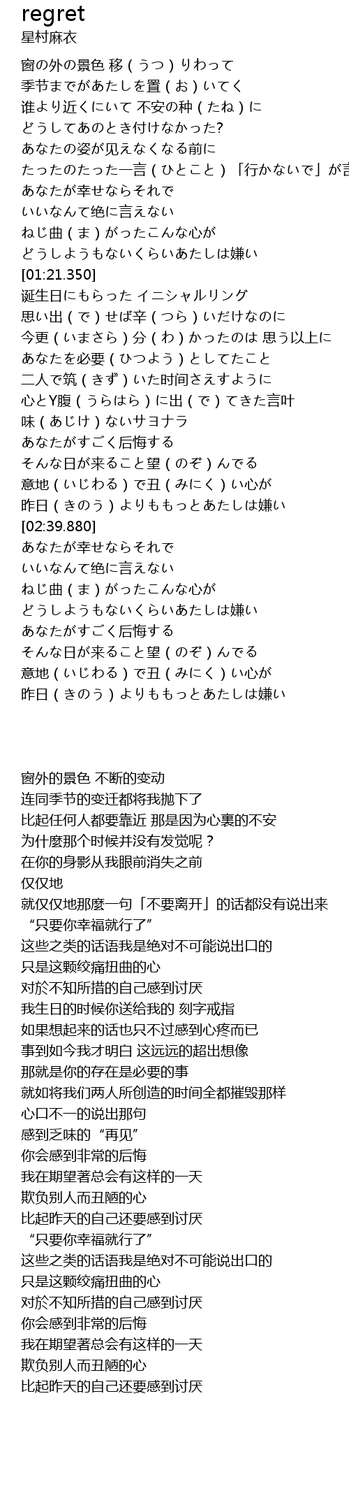 | [00:44.690] | たったのたった一言(ひとこと)「行かないで」が言(い)えなかった |