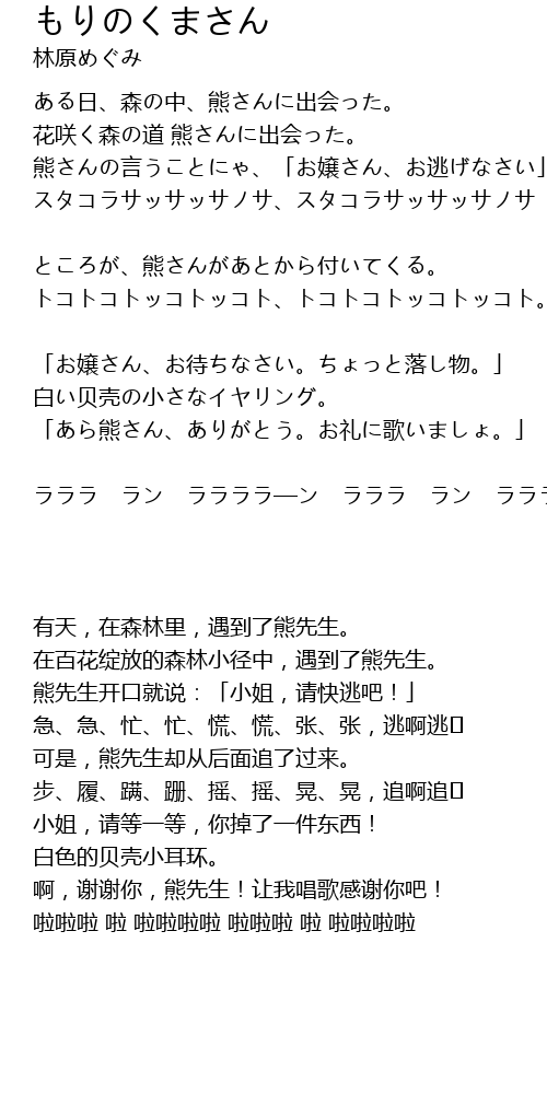 | [00:13.44] | ある日、森の中、熊さんに出会った。 |