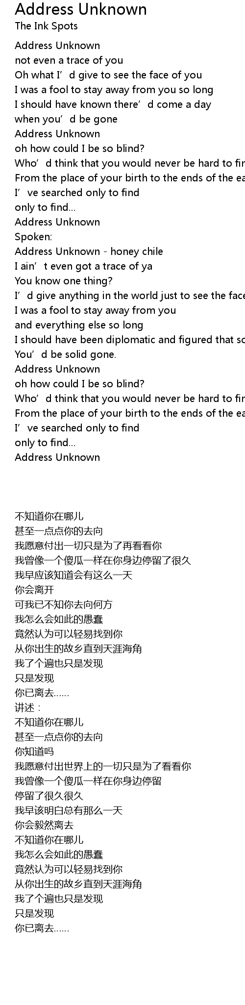 | [01:34.220] | Address Unknown - honey chile |