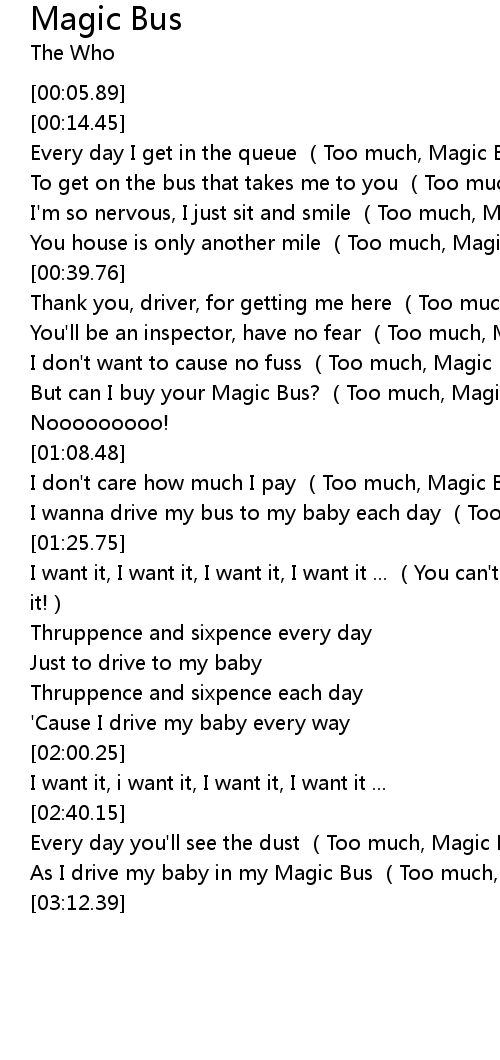 | [00:54.99] | But can I buy your Magic Bus? Too much, Magic Bus |