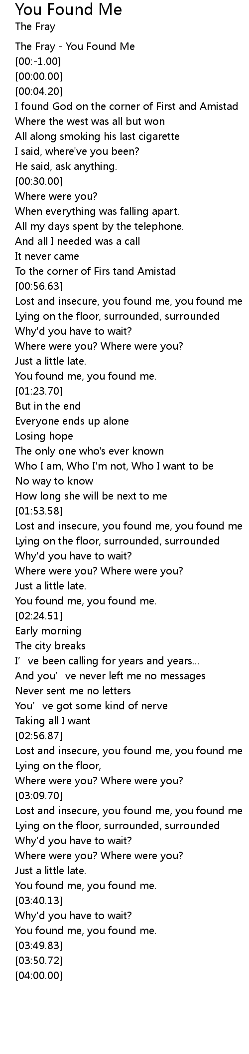 | [03:10.19] | Lost and insecure, you found me, you found me |