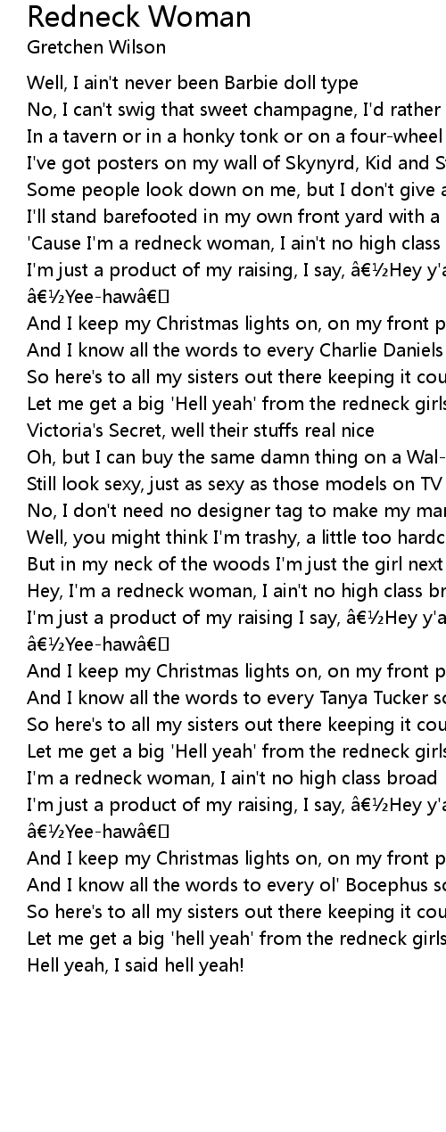 | I' m a redneck woman, I ain' t no high class broad | |
