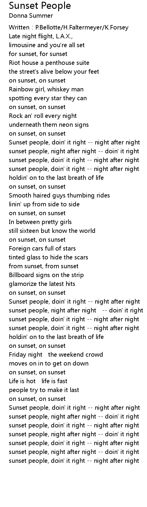 | Sunset people, doin' it right night after night | |