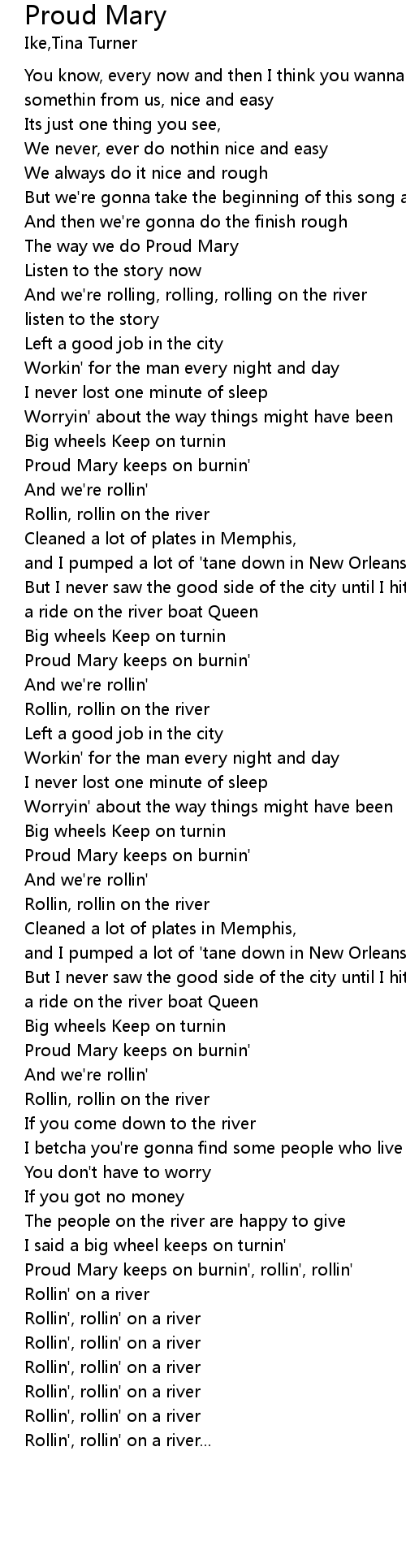Proud Mary keeps on burnin', rollin', rollin' |