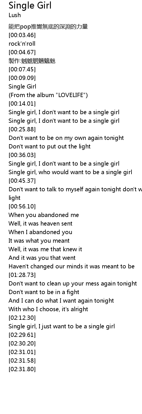| [00:36.33] | Single girl, I don' t want to be a single girl |