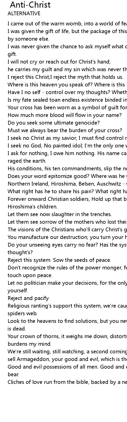 We're still waiting, still watching, a second coming, more guilt to sell Armageddon, your good and evil, which is the side which speaks for you? |