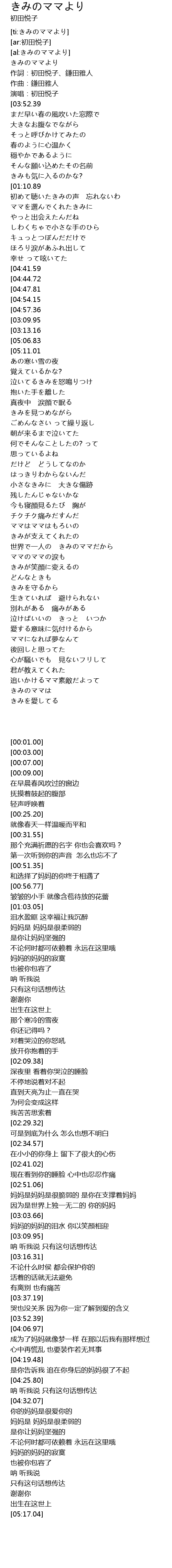 | [00:09.00][03:52.39][05:17.04] | 初田悦子-きみのママより |
