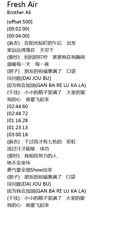 | [02:50.17][01:16.28] | ni hui kan jian wo zai tian kong ao xiang Fresh Fresh Fresh |