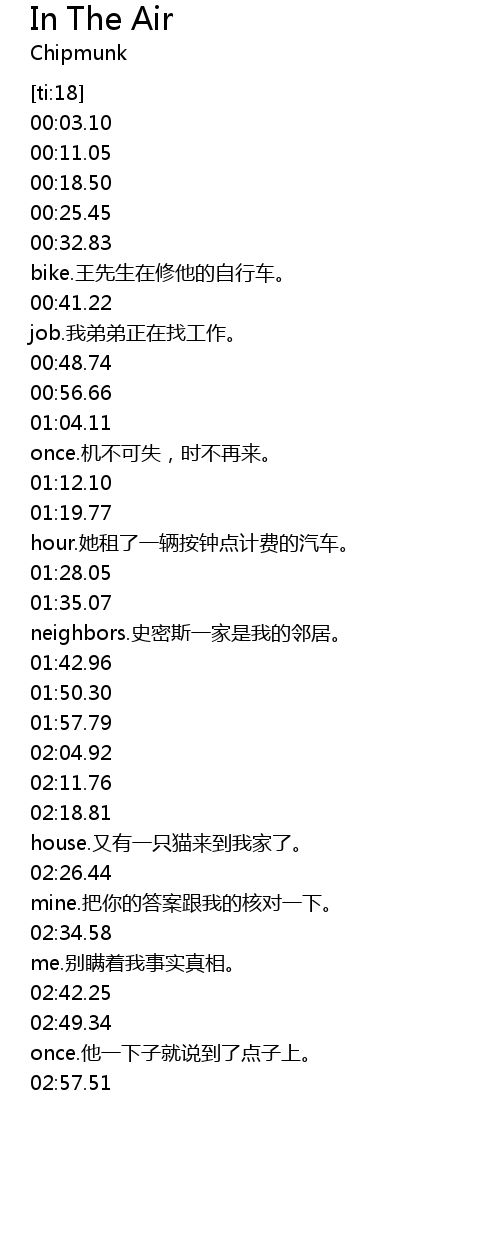 | [01:23.313]01:19.77] | She hired a car by the hour. tā zū le yī liàng àn zhōng diǎn jì fèi de qì chē. |