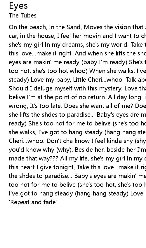 | On the beach, In the Sand, Moves the vision that a guy could understand. In the car, in the house, I feel her movin and I want to check it out. All my life, she's my girl In my dreams, she's my world. Take this heart I give tonight, Take this love...make it right. And when she lifts the shdes to paradise... Baby's eyes are makin' me ready (baby I'm ready) She's too hot for me to belive (she's too hot, she's too hot whoo) When she walks, I've got to hang steady (hang hang steady) Love my baby, Little Cheri...whoo. Talk about her, paint a picture, Should I deluge myself with this mystery. Love that girl, she loves her man, I belive I'm at the point of no return. All day long, i can't wait, Right or wrong, It's too late. Does she want all of me? Does she see what I see? And when she lifts the shdes to paradise... Baby's eyes are makin' me ready (baby I'm ready) She's too hot for me to belive (she's too hot, she's too hot whoo) When she walks, I've got to hang steady (hang hang steady) Love my baby, Little Cheri...whoo. Don't cha know I feel kinda shy (shy), If you knew her, I'd think you'd know why (why), Beside her, beside her I'm OK, All the finer things ever made that way??? All my life, she's my girl In my dreams, she's my world. Take this heart I give tonight, Take this love...make it right. And when she lifts the shdes to paradise... Baby's eyes are makin' me ready (baby I'm ready) She's too hot for me to belive (she's too hot, she's too hot whoo) When she walks, I've got to hang steady (hang hang steady) Love my baby, Little Cheri...whoo. 'Repeat and fade' |