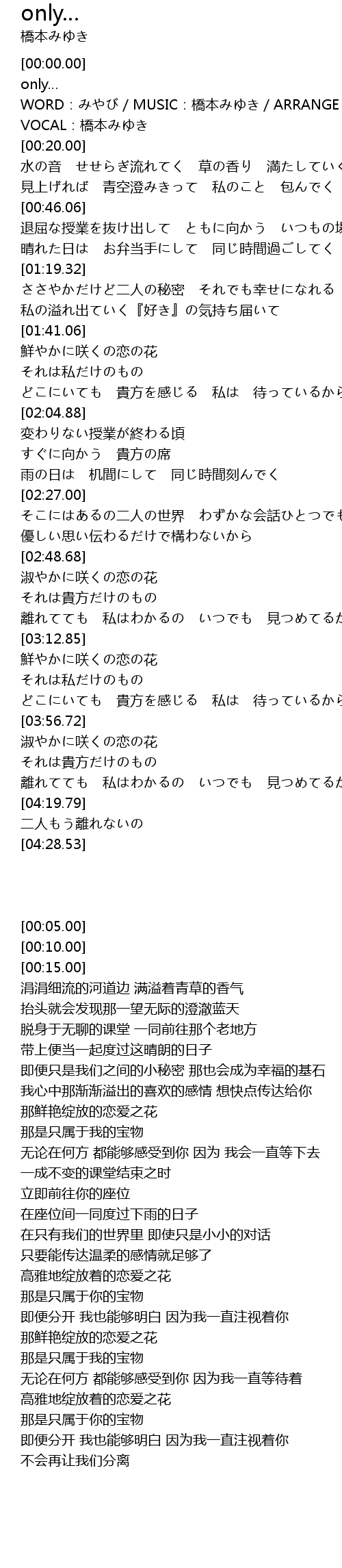 | [00:10.00] | WORD:みやび/MUSIC:橋本みゆき/ARRANGE:田辺トシノ |